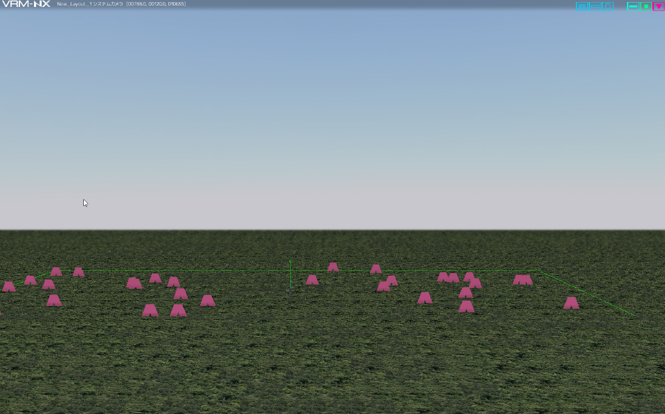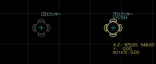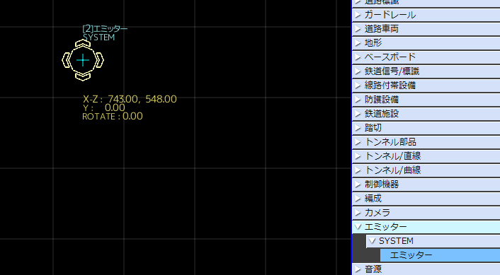 プラットホーム上に表示するため、プラットホームの上面の高さを調べる必要があります。プラットホームを選択して、部品情報の「上面」の数値を確認します。配置高度+上面の合計値が、エミッターを配置する高さになります。