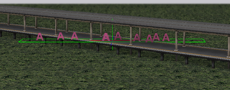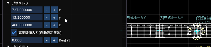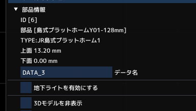 プラットホーム上に表示するため、プラットホームの上面の高さを調べる必要があります。プラットホームを選択して、部品情報の「上面」の数値を確認します。配置高度+上面の合計値が、エミッターを配置する高さになります。