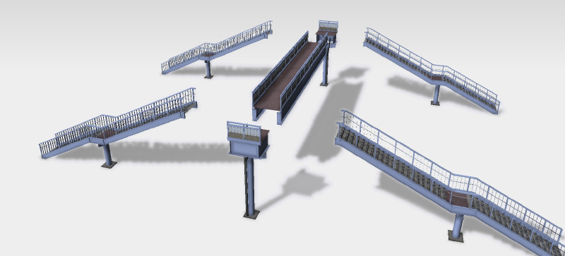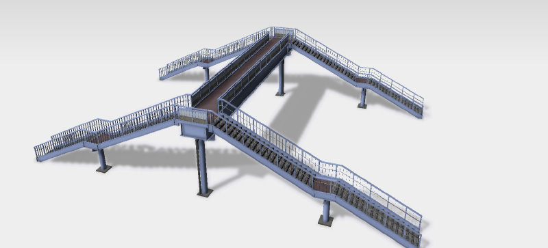 開発中の歩道橋は、橋桁、支柱、階段を組み合わせて、いろいろな形状をつくることができます。